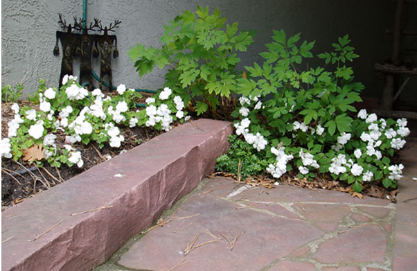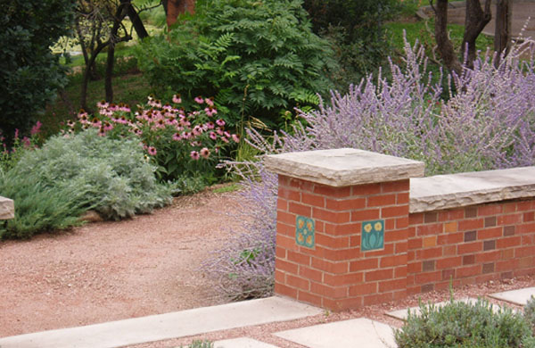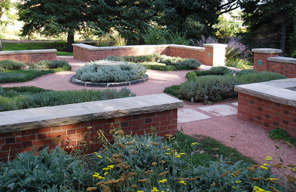 The gardens’ formal axial layout links the historic Van Briggle Building visually thru the lawn ellipse, the arbor and rests in the Thyme Garden with its centerpiece Van Briggle sundial. Considering the same axis in the other direction, the park’s pastoral fishing pond – water – is linked thru the Thyme Garden, thru the arbor way and onto the luxurious elliptical lawn. The water connection to the lawn cannot be missed, but is counterbalanced by the surrounding water efficient plant beds, holding the xeriscape ethic clear.