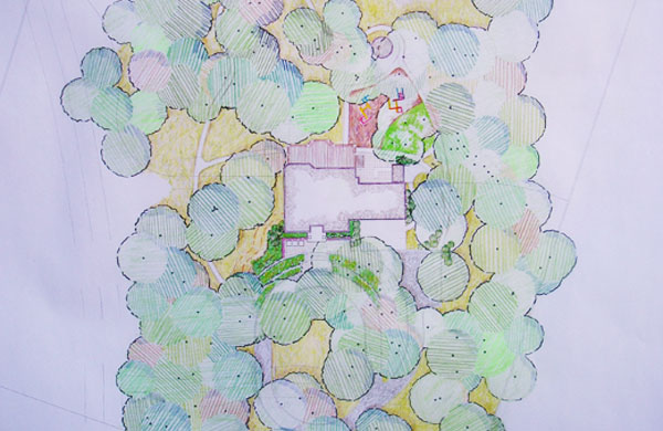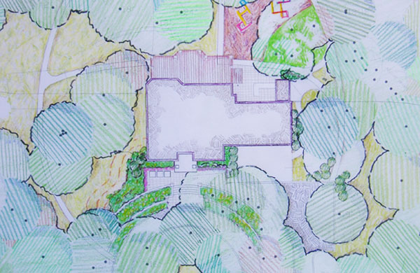 This concept plan marries the client's desire for a formal entry with the open cathedral-like pines on this property.