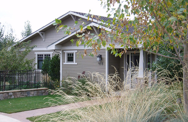 The Arts and Crafts integration of home and garden is fully embraced in this cozy bungalow transformation. Transformation for this garden necessitated reining in a oversized driveway and garage and extensive site re-grading.